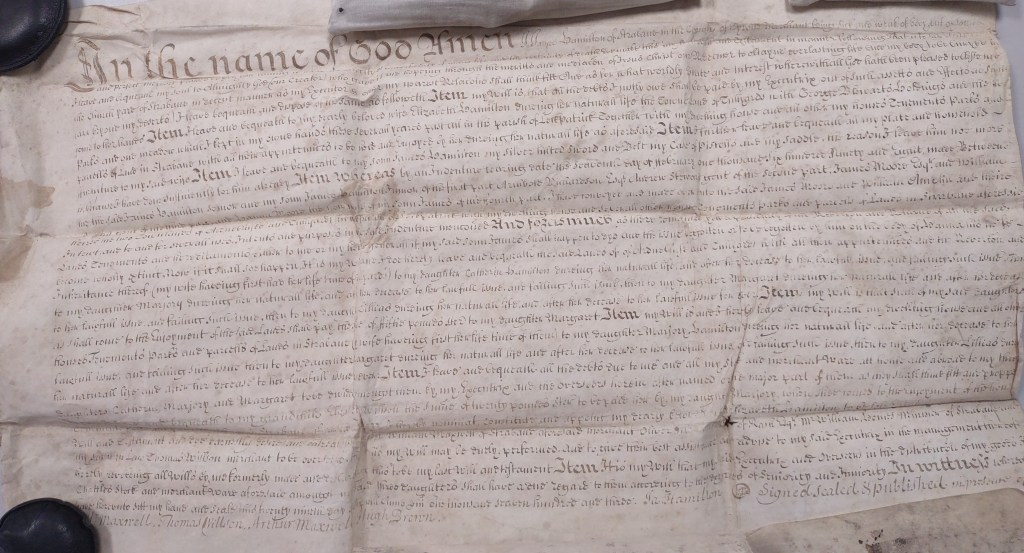 In November 2024 I was able to visit PRONI for the first time. This wasn’t a research trip per se. I was in Belfast on holiday, but I was able to spend much of one day exploring the records. One of the items I found there involved my ancestor the Rev William Homes of Strabane. In his 1703 will (PRONI D623/B/3/6) James Hamilton of Strabane Merchant asks that “William Maxwell of Strabane aforesaid merchant, Oliver McCausland of Rash Esq., Mr William Homes, minister of Strabane and my son-in-law Thomas Willson merchant to be overseers that this my will be duly performed and to give their best assistance and advice to my said executrix in the management thereof.”